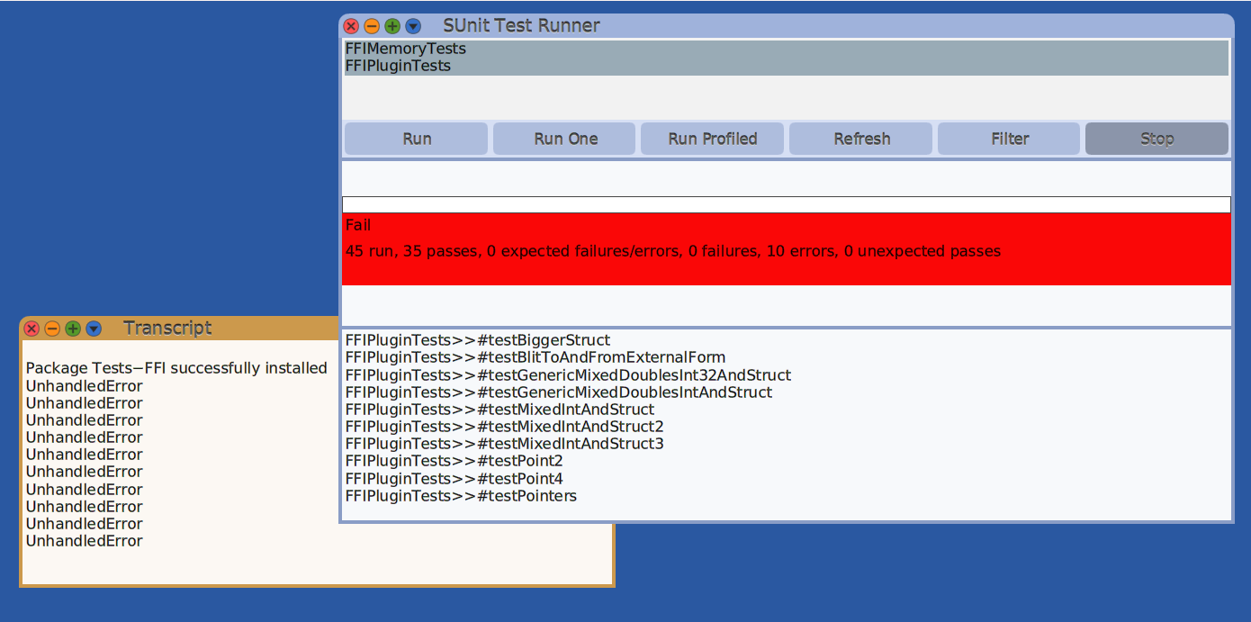Then open a fresh cuis image with the new vm, install FFI tests and run.